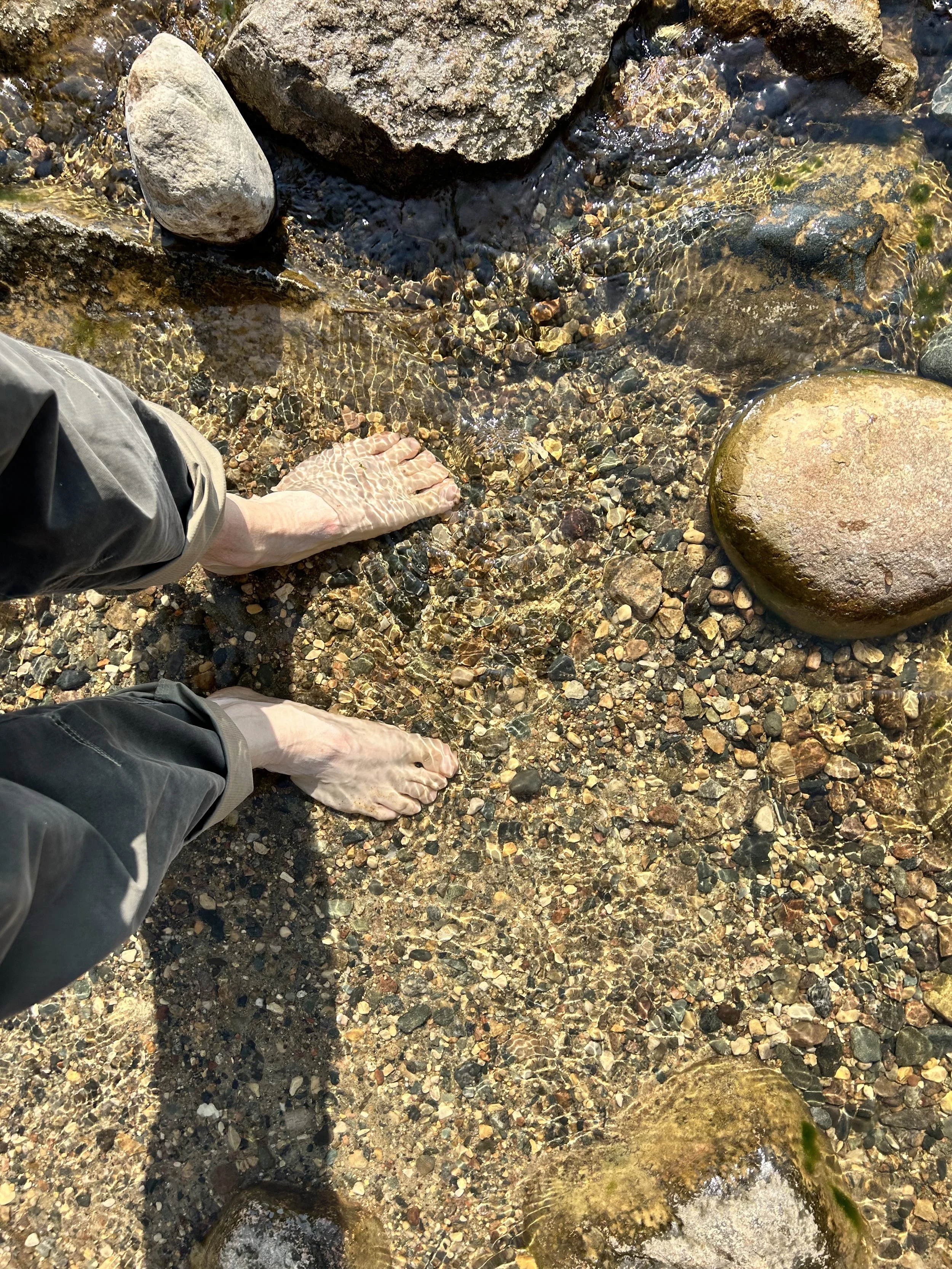 I peeled off my socks and shoes and set them under a nearby tree, then limped over jagged gravel to reach the smooth stones at the water’s edge. Stepping in, I stood shin-deep in the cool water. I had come for quiet contemplation, to bask in the park’s natural beauty and meditate.
